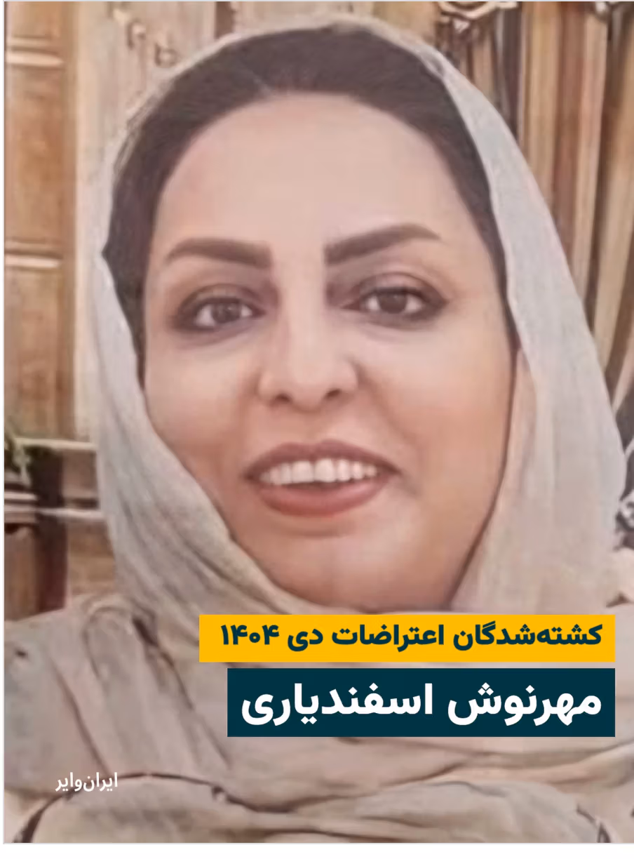 مهرنوش اسفندیاری، مادر دو فرزند، پنجشنبه ۱۸دی۱۴۰۴ با شلیک نیروهای مسلح جمهوری اسلامی کشته شد. ماموران حکومتی، مهرنوش اسفندیاری را در منطقه «افسریه» تهران از پشت با گلوله جنگی هدف سلاح خود قرار دادند. ماموران جمهوری اسلامی برای تحویل پیکر مهرنوش اسفندیاری مبلغ ۲۰۰میلیون تومان از خانوادهاش گرفتند.